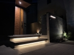 【フロート階段×ライティング】夜景が美しいホテルライクなエントランスデザイン・姫路市新築外構 昼と夜で表情を一変!足元の光が優しく家族を迎え入れる、浮遊感のあるアプローチ 黒のボックスデザインが印象的なお住まいに合わせ、門まわりもダークトーンの大判タイルでシックに統一しました。 このエントランスの主役は、蹴込み(けこみ)を深く入れ、まるで宙に浮いているかのように見せた「フロート階段」です。昼間はシャープな陰影が洗練されたモダンスタイルを演出し、夜になると蹴込み部分に仕込んだラインライトが点灯。柔らかな光がステップを浮き上がらせ、まるでリゾートホテルのような幻想的な雰囲気を醸し出します。この光はデザイン性だけでなく、夜間の足元の安全性を高める役割も果たしています。また、機能面では宅配ボックスを門柱裏にスッキリと組み込み、生活感を感じさせないスマートなファサードを実現しました。「ただいま」と帰ってくるたびに、誇らしい気持ちになれる。 そんな光と影のコントラストが美しい、上質なエントランス空間です。プラン・打ち合わせ・施工管理担当:植田1級エクステリアプランナー登録番号28-1EX-0026 ご提案パースBefore|After住宅建築では、玄関ポーチを最小限で施工を終えていただいて、外構目線からプラン&施工しました。お客様とじっくり対話を重ね、「建物とどう調和させるか」を大事に考えました。採用したのは、重厚感のある大判タイルの門柱。そしてアプローチは空間を引き締めるダークグレー… | ![]() |