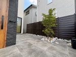 玄関ポーチから繋がるモダンなガーデンテラス・姫路市新築外構 早めのご相談で満足度の高い外まわりを実現! 建物建設中からご相談いただいた新築外構プランです。落ち着いたモダンな600角タイル【アイコット・アーレイ】で、玄関ポーチと中庭のテラスを一体化したデザインに仕上げました。境界部分には、木目調ボード【モクプラボード】を設置し、プライベートを確保しました。ボードの足元には水はけも兼ねたクラッシュロックでドレスアップ。重厚感ある門柱裏にはシンボルツリー『常緑ヤマボウシ』で彩りをプラス。また、モクプラボードの柱には【ウェザーシェードロール】の日除けを取り付け出来る専用金具を設置、脱着できる仕様とし、夏場の日差しを遮り、快適なガーデンライフを楽しめる空間としました。プラン・打ち合わせ・施工管理担当:植田1級エクステリアプランナー登録番号28-1EX-0026 ご提案パースBefore|After着工前建物完成後施工開始完工玄関ポーチからフラットに繋がる中庭が完成施工中モクプラボードの柱取り付け&テラスのタイルテラス嵩上げ&クラッシャーラン転圧施工中玄関ポーチ〜テラスは、600角タイル【アーレイ(D64)】を張っています。施工中門柱にはポストを付けず、宅配ボックスと組み合わせが出来る【tumiki】をセレクト!多様な大きさのボックスからチョイスし、自分好みのボックスを積み重ね出来ます。施工中植栽スペースに常緑ヤマボウシを植え、クラッシュロックで仕上げ… | ![]() |