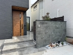 姫路市新築外構・外構でつくる開放的なカッコいい600角タイルの玄関ポーチ 昼も夜も美しい平屋の門まわり 建物の計画段階からご相談をいただいたプラン&施工です。落ち着いた色合いの平屋住宅に重厚感ある門まわりをプランニングしました。門柱は300×600の【セラレバンテタイル】で施工し、ポストと宅配ボックスを埋め込みました。玄関ポーチ〜アプローチ部分は、600角タイルを使ったフロート階段とし、見た目のカッコよさはもちろん、左右の動線も考慮した開放的なデザインとしました。平屋の玄関アプローチは特に開放的に施工すると建物が引き立ちます。シンボルツリーはイロハモミジ。足元はクラッシュロックとジンチョウゲを植えて、和モダンテイストも演出しました。プラン・打ち合わせ・施工管理担当:植田1級エクステリアプランナー登録番号28-1EX-0026 ご提案パースBefore|After着工前角地の平屋住宅完工玄関ポーチは、広い開放的なフロート階段のアプローチを施工。LEDライトも仕込んであります。施工中玄関ポーチは広さを取るため、ブロック積みで拡張施工中玄関ポーチタイルの色決め。実物タイルで色の最終確認します。施工中フロート階段の下地土間コンクリート打ち。フロート部分は型枠で下地をします。施工中ポーチ&アプローチは、『アイコット600角・ナバラ』を張っていきます。玄関からのビュー。玄関ポーチから門柱まで続く一体化したアプローチ。600角タイルを使用することで広さを感じるアプロー… | ![]() |