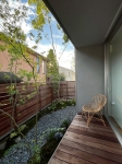 既存のものを活かしながら新築外構 神奈川県秦野市H様邸 駐車場は、1台はコンクリート打ちで、もう1台は自然石敷き+草目地に。アプローチ階段は枕木を使い、踏み面に自然石を敷き、自然石敷きと草目地のアプローチと駐車場と統一感があり、ナチュラルな雰囲気に。門柱はハードウッド材でオリジナル施工しています。擁壁の土留めを、ロックガーデン風に自然石と下草類でしてます。玄関側です。自然石敷きのアプローチを、雑木の木々を愛でながらある小径のように。庭側です。古家のあった樹木も撤去することなく剪定し、新に雑木の木々を足しています。L字型にステップを付けて、低床デッキ。デッキ上に木陰が出来るように木々を植えてます。 | ![]() |