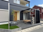 角地の平屋。プラスG部材にルミノスタイルを張った門柱とプライベートガーデン・姫路市新築外構 角地の特権。「魅せる」と「隠す」を両立した平屋のリゾート空間建物計画の段階からご相談いただき、建物と外構が一体となった美しい平屋の住まいを実現することができました。角地という立地を活かして、エントランスは重厚感と開放感を兼ね備えたオープンな構えに。一方で、ご家族のくつろぎ空間である中庭は、プライバシーを徹底的に守るクローズドな設計に。「開放感」と「安心感」、その両方を叶えた贅沢なプランです。〇毎日が誇らしくなる、迎賓のエントランス玄関ポーチも外構の一部としてトータルでデザインすることで、オリジナリティのあるエントランスが生まれました。600角の大判タイルを使った玄関ポーチは、まるで宙に浮いているかのような「浮き階段」仕様。プラスGを使った重厚感のあるボーダータイル門柱と縦格子が組み合わさり、スタイリッシュで洗練された「家の顔」となりました。Before|After〇大判タイルが織りなす上質な余白。浮き階段仕様の洗練された玄関ポーチ左手の重厚なアクセントウォールと、右手のルーバーから差し込む光のコントラストが、訪れる人を印象的に迎え入れます。Before|After〇視線を気にせずくつろげる「第二のリビング」玄関ポーチ横の門扉の先には、完全にプライベートが守られた「第二のリビング」が広がります。周囲の視線を気にすることなく、タイルテラスでゆっくりとコーヒーを飲んだり、ご家族でBBQを… | ![]() |