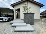 姫路市新築外構・外構でつくる開放的なカッコいい600角タイルの玄関ポーチ 昼も夜も美しい平屋の門まわり 建物の計画段階からご相談をいただいたプラン&施工です。落ち着いた色合いの平屋住宅に重厚感ある門まわりをプランニングしました。門柱は300×600の【セラレバンテタイル】で施工し、ポストと宅配ボックスを埋め込みました。玄関ポーチ〜アプローチ部分は、600角タイルを使ったフロート階段とし、見た目のカッコよさはもちろん、左右の動線も考慮した開放的なデザインとしました。平屋の玄関アプローチは特に開放的に施工すると建物が引き立ちます。シンボルツリーはイロハモミジ。足元はクラッシュロックとジンチョウゲを植えて、和モダンテイストも演出しました。プラン・打ち合わせ・施工管理担当:植田1級エクステリアプランナー登録番号28-1EX-0026 ご提案パースBefore|After着工前角地の平屋住宅完工玄関ポーチは、広い開放的なフロート階段のアプローチを施工。LEDライトも仕込んであります。施工中玄関ポーチは広さを取るため、ブロック積みで拡張施工中玄関ポーチタイルの色決め。実物タイルで色の最終確認します。施工中フロート階段の下地土間コンクリート打ち。フロート部分は型枠で下地をします。施工中ポーチ&アプローチは、『アイコット600角・ナバラ』を張っていきます。玄関からのビュー。玄関ポーチから門柱まで続く一体化したアプローチ。600角タイルを使用することで広さを感じるアプロー… | ![]() |
